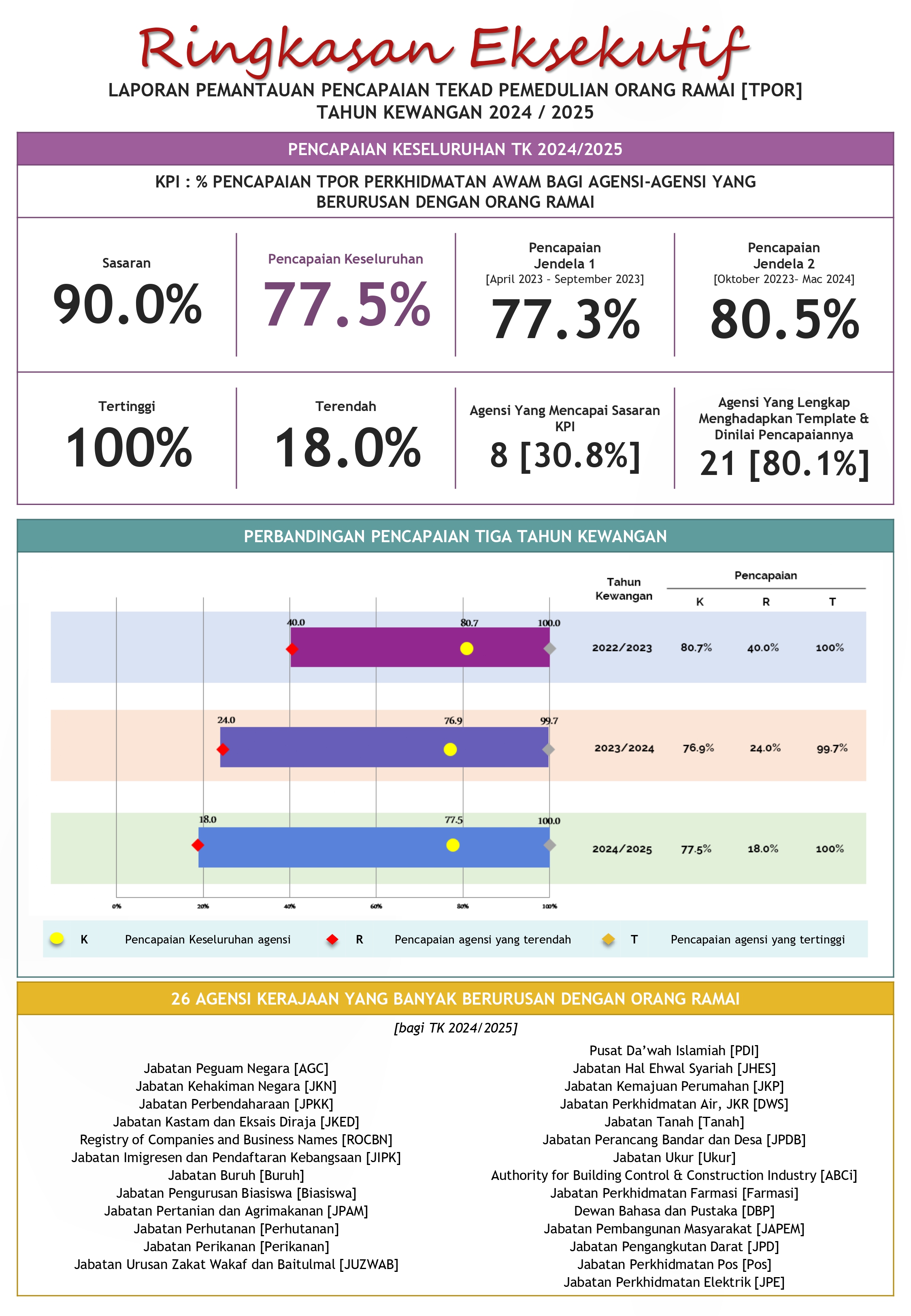 Bermula pada tahun kewangan 2017/2018, 34 agensi kerajaan telah dikenal pasti sebagai agensi yang banyak berurusan dengan orang ramai telah dipantau pencapaian TPORnya.