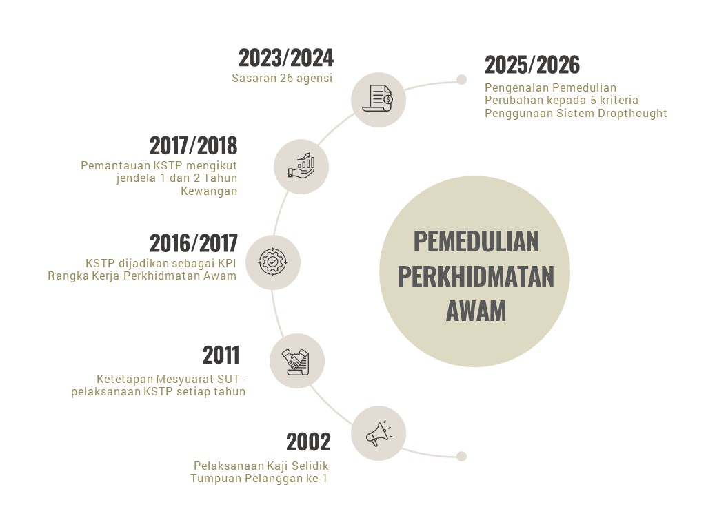 Ke arah itu, Jabatan Perkhidmatan Pengurusan (MSD) telah memperkenalkan Kaji Selidik Tumpuan Pelanggan (KSTP) dalam Perkhidmatan Awam pada tahun 2002. KSTP dilaksanakan bagi menilai kualiti penyampaian perkhidmatan di kaunter-kaunter perkhidmatan Kerajaan, dengan memberi tumpuan kepada tiga (3) aspek utama, iaitu: persekitaran dan kemudahan; interaksi pegawai/ kakitangan dengan pelanggan; dan ketrampilan. Borang KSTP diedarkan kepada pelanggan di 26 agensi Kerajaan yang banyak berurusan dengan orang ramai. Pemantauan terhadap pelaksanaan dan pencapaian KSTP dilaporkan ke MSD sebanyak 2 kali setiap tahun, iaitu Jendela 1 (April hingga September) dan Jendela 2 (Oktober hingga Mac).